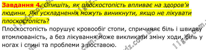 Завдання 4. Опишіть, як плоскостопість впливає на здоров’я людини. Які ускладнення можуть виникнути, якщо не лікувати плоскостопість? Плоскостопість порушує кровообіг стопи, спричиняє біль і швидку втомлюваність, а без лікування може викликати зміну ходи, біль у ногах і спині та проблеми з поставою.