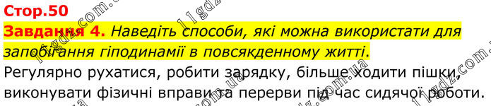 Стор.50 Завдання 4. Наведіть способи, які можна використати для запобігання гіподинамії в повсякденному житті. Регулярно рухатися, робити зарядку, більше ходити пішки, виконувати фізичні вправи та перерви під час сидячої роботи.