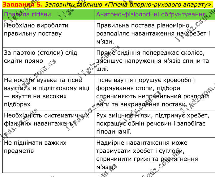 Завдання 5. Заповніть таблицю «Гігієна опорно-рухового апарату». Правила гігієни Анатомо-фізіологічні обґрунтування Необхідно виробляти правильну поставу Правильна постава рівномірно розподіляє навантаження на хребет і м’язи. За партою (столом) слід сидіти прямо Пряме сидіння попереджає сколіоз, зменшує напруження м’язів спини та шиї. Не носити вузьке та тісне взуття, а в підлітковому віці — взуття на високих підборах Тісне взуття порушує кровообіг і формування стопи, підбори спричиняють неправильний розподіл ваги та викривлення постави. Необхідність систематичних фізичних навантажень Рух зміцнює м’язи, підтримує хребет, покращує обмін речовин і запобігає гіподинамії. Не піднімати важких предметів Надмірне навантаження може травмувати хребет і суглоби, спричинити грижі та розтягнення м’язів.