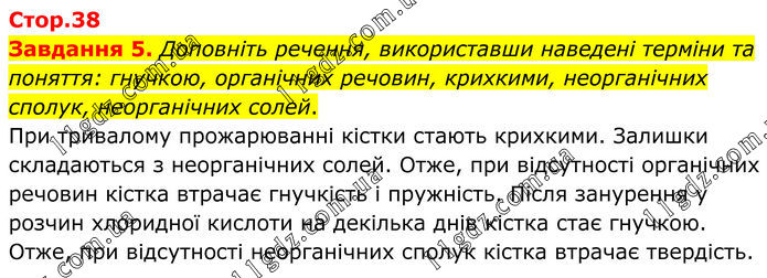 Завдання 5. Доповніть речення, використавши наведені терміни та поняття: гнучкою, органічних речовин, крихкими, неорганічних сполук, неорганічних солей. При тривалому прожарюванні кістки стають крихкими. Залишки складаються з неорганічних солей. Отже, при відсутності органічних речовин кістка втрачає гнучкість і пружність. Після занурення у розчин хлоридної кислоти на декілька днів кістка стає гнучкою. Отже, при відсутності неорганічних сполук кістка втрачає твердість.
