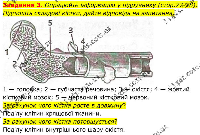 Завдання 3. Опрацюйте інформацію у підручнику (стор.77-78). Підпишіть складові кістки, дайте відповідь на запитання. 1 — головка; 2 — губчаста речовина; 3 — окістя; 4 — жовтий кістковий мозок; 5 — червоний кістковий мозок. За рахунок чого кістка росте в довжину? Поділу клітин хрящової тканини. За рахунок чого кістка потовщується? Поділу клітин внутрішнього шару окістя.
