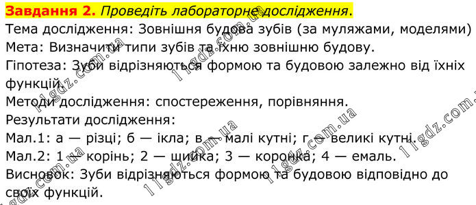 Завдання 2. Проведіть лабораторне дослідження. Тема дослідження: Зовнішня будова зубів (за муляжами, моделями) Мета: Визначити типи зубів та їхню зовнішню будову. Гіпотеза: Зуби відрізняються формою та будовою залежно від їхніх функцій. Методи дослідження: спостереження, порівняння. Результати дослідження: Мал.1: а — різці; б — ікла; в — малі кутні; г — великі кутні. Мал.2: 1 — корінь; 2 — шийка; 3 — коронка; 4 — емаль. Висновок: Зуби відрізняються формою та будовою відповідно до своїх функцій.