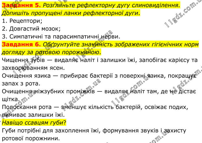 Завдання 5. Розгляньте рефлекторну дугу слиновиділення. Допишіть пропущені ланки рефлекторної дуги. 1. Рецептори; 2. Довгастий мозок; 3. Симпатичні та парасимпатичні нерви. Завдання 6. Обґрунтуйте значимість зображених гігієнічних норм догляду за ротовою порожниною. Чищення зубів — видаляє наліт і залишки їжі, запобігає карієсу та захворюванням ясен. Очищення язика — прибирає бактерії з поверхні язика, покращує запах з рота. Очищення міжзубних проміжків — видаляє наліт там, де не дістає щітка. Полоскання рота — зменшує кількість бактерій, освіжає подих, вимиває залишки їжі. Навіщо ссавцям губи? Губи потрібні для захоплення їжі, формування звуків і захисту ротової порожнини.