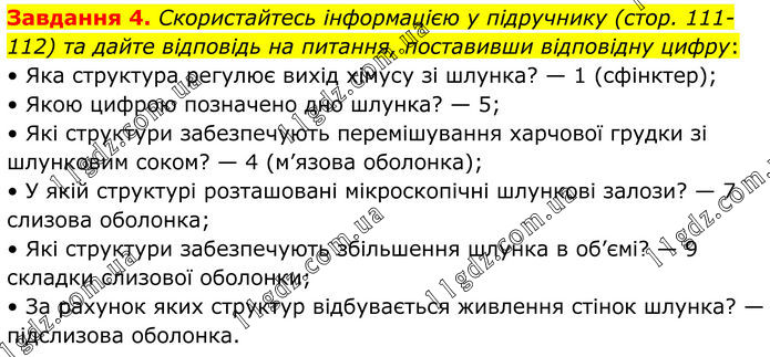 Завдання 4. Скористайтесь інформацією у підручнику (стор. 111-112) та дайте відповідь на питання, поставивши відповідну цифру: • Яка структура регулює вихід хімусу зі шлунка? — 1 (сфінктер); • Якою цифрою позначено дно шлунка? — 5; • Які структури забезпечують перемішування харчової грудки зі шлунковим соком? — 4 (м’язова оболонка); • У якій структурі розташовані мікроскопічні шлункові залози? — 7 слизова оболонка; • Які структури забезпечують збільшення шлунка в об’ємі? — 9 складки слизової оболонки; • За рахунок яких структур відбувається живлення стінок шлунка? — підслизова оболонка.