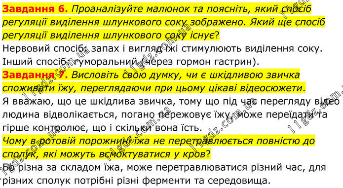 Завдання 6. Проаналізуйте малюнок та поясніть, який спосіб регуляції виділення шлункового соку зображено. Який ще спосіб регуляції виділення шлункового соку існує? Нервовий спосіб: запах і вигляд їжі стимулюють виділення соку. Інший спосіб: гуморальний (через гормон гастрин). Завдання 7. Висловіть свою думку, чи є шкідливою звичка споживати їжу, переглядаючи при цьому цікаві відеосюжети. Я вважаю, що це шкідлива звичка, тому що під час перегляду відео людина відволікається, погано пережовує їжу, може переїдати та гірше контролює, що і скільки вона їсть. Чому в ротовій порожнині їжа не перетравлюється повністю до сполук, які можуть всмоктуватися у кров? Бо різна за складом їжа, може перетравлюватися різний час, для різних сполук потрібні різні ферменти та середовища.