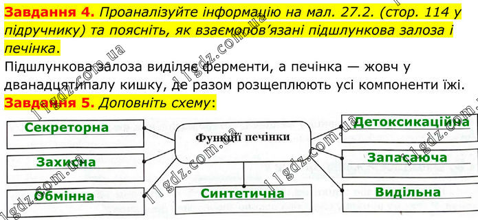 Завдання 4. Проаналізуйте інформацію на мал. 27.2. (стор. 114 у підручнику) та поясніть, як взаємопов’язані підшлункова залоза і печінка. Підшлункова залоза виділяє ферменти, а печінка — жовч у дванадцятипалу кишку, де разом розщеплюють усі компоненти їжі. Завдання 5. Доповніть схему: