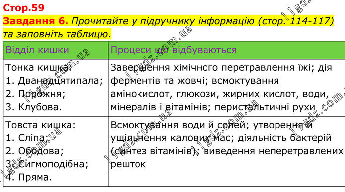 Стор.59 Завдання 6. Прочитайте у підручнику інформацію (стор. 114-117) та заповніть таблицю. Відділ кишки Процеси що відбуваються Тонка кишка: 1. Дванадцятипала; 2. Порожня; 3. Клубова. Завершення хімічного перетравлення їжі; дія ферментів та жовчі; всмоктування амінокислот, глюкози, жирних кислот, води, мінералів і вітамінів; перистальтичні рухи Товста кишка: 1. Сліпа; 2. Ободова; 3. Сигмоподібна; 4. Пряма. Всмоктування води й солей; утворення й ущільнення калових мас; діяльність бактерій (синтез вітамінів); виведення неперетравлених решток