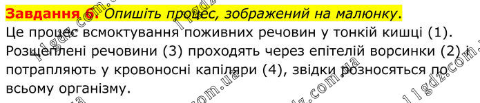 Завдання 6. Опишіть процес, зображений на малюнку. Це процес всмоктування поживних речовин у тонкій кишці (1). Розщеплені речовини (3) проходять через епітелій ворсинки (2) і потрапляють у кровоносні капіляри (4), звідки розносяться по всьому організму.