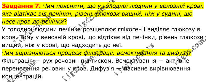 Завдання 7. Чим пояснити, що у голодної людини у венозній крові, яка відтікає від печінки, рівень глюкози вищий, ніж у судині, що несе кров до печінки? У голодної людини печінка розщеплює глікоген і виділяє глюкозу в кров. Тому у венозній крові, що відтікає від печінки, рівень глюкози вищий, ніж у крові, що надходить до неї. Чим відрізняються процеси фільтрації, всмоктування та дифузії? Фільтрація — рух речовин під тиском. Всмоктування — активне перенесення речовин у кров. Дифузія — пасивне вирівнювання концентрацій.