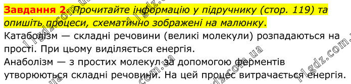 Завдання 2. Прочитайте інформацію у підручнику (стор. 119) та опишіть процеси, схематично зображені на малюнку. Катаболізм — складні речовини (великі молекули) розпадаються на прості. При цьому виділяється енергія. Анаболізм — з простих молекул за допомогою ферментів утворюються складні речовини. На цей процес витрачається енергія.