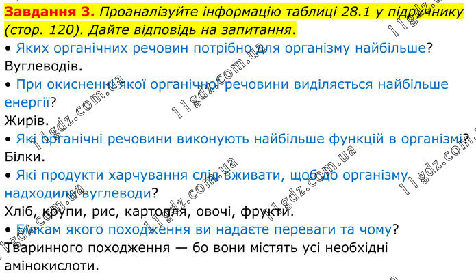 Завдання 3. Проаналізуйте інформацію таблиці 28.1 у підручнику (стор. 120). Дайте відповідь на запитання. • Яких органічних речовин потрібно для організму найбільше? Вуглеводів. • При окисненні якої органічної речовини виділяється найбільше енергії? Жирів. • Які органічні речовини виконують найбільше функцій в організмі? Білки. • Які продукти харчування слід вживати, щоб до організму надходили вуглеводи? Хліб, крупи, рис, картопля, овочі, фрукти. • Білкам якого походження ви надаєте переваги та чому? Тваринного походження — бо вони містять усі необхідні амінокислоти.