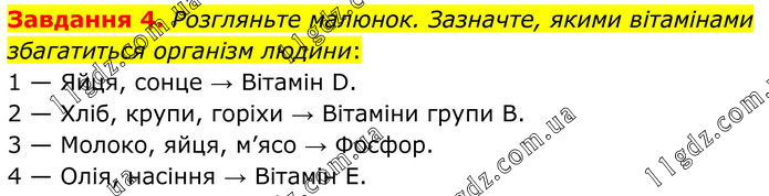 Завдання 4. Розгляньте малюнок. Зазначте, якими вітамінами збагатиться організм людини: 1 — Яйця, сонце → Вітамін D. 2 — Хліб, крупи, горіхи → Вітаміни групи B. 3 — Молоко, яйця, м’ясо → Фосфор. 4 — Олія, насіння → Вітамін E.