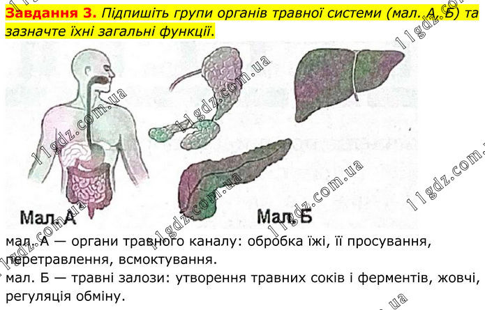 Завдання 3. Підпишіть групи органів травної системи (мал. А, Б) та зазначте їхні загальні функції. мал. А — органи травного каналу: обробка їжі, її просування, перетравлення, всмоктування. мал. Б — травні залози: утворення травних соків і ферментів, жовчі, регуляція обміну.