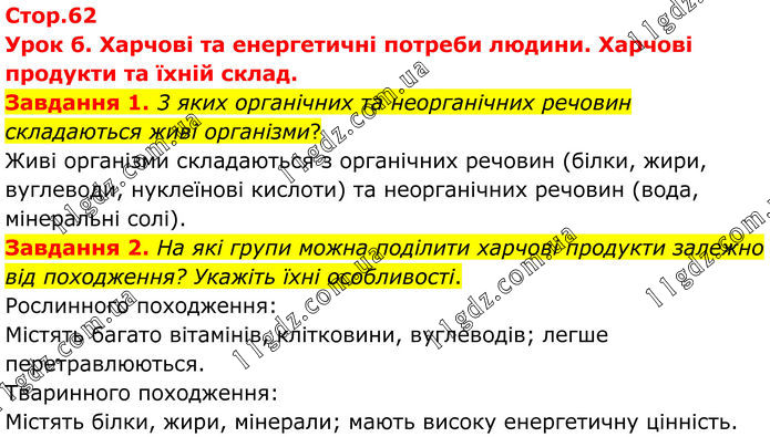 Урок б. Харчові та енергетичні потреби людини. Харчові продукти та їхній склад. Завдання 1. 3 яких органічних та неорганічних речовин складаються живі організми? Живі організми складаються з органічних речовин (білки, жири, вуглеводи, нуклеїнові кислоти) та неорганічних речовин (вода, мінеральні солі). Завдання 2. На які групи можна поділити харчові продукти залежно від походження? Укажіть їхні особливості. Рослинного походження: Містять багато вітамінів, клітковини, вуглеводів; легше перетравлюються. Тваринного походження: Містять білки, жири, мінерали; мають високу енергетичну цінність.