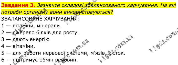 Завдання 3. Зазначте складові збалансованого харчування. На які потреби організму вони використовуються? ЗБАЛАНСОВАНЕ ХАРЧУВАННЯ: 1 — вітаміни, мінерали. 2 — джерело білків для росту. 3 — дають енергію 4 — вітаміни. 5 — для роботи нервової системи, м’язів, кісток. 6 — підтримує обмін речовин.