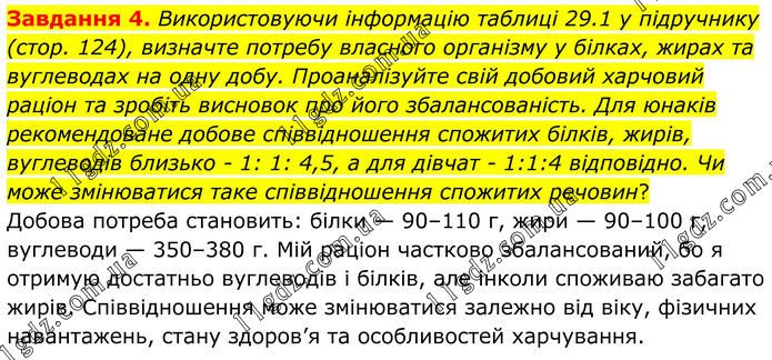 Завдання 4. Використовуючи інформацію таблиці 29.1 у підручнику (стор. 124), визначте потребу власного організму у білках, жирах та вуглеводах на одну добу. Проаналізуйте свій добовий харчовий раціон та зробіть висновок про його збалансованість. Для юнаків рекомендоване добове співвідношення спожитих білків, жирів, вуглеводів близько - 1: 1: 4,5, а для дівчат - 1:1:4 відповідно. Чи може змінюватися таке співвідношення спожитих речовин? Добова потреба становить: білки — 90–110 г, жири — 90–100 г, вуглеводи — 350–380 г. Мій раціон частково збалансований, бо я отримую достатньо вуглеводів і білків, але інколи споживаю забагато жирів. Співвідношення може змінюватися залежно від віку, фізичних навантажень, стану здоров’я та особливостей харчування.
