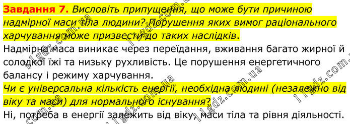 Завдання 7. Висловіть припущення, що може бути причиною надмірної маси тіла людини? Порушення яких вимог раціонального харчування може призвести до таких наслідків. Надмірна маса виникає через переїдання, вживання багато жирної й солодкої їжі та низьку рухливість. Це порушення енергетичного балансу і режиму харчування. Чи є універсальна кількість енергії, необхідна людині (незалежно від віку та маси) для нормального існування? Ні, потреба в енергії залежить від віку, маси тіла та рівня діяльності.