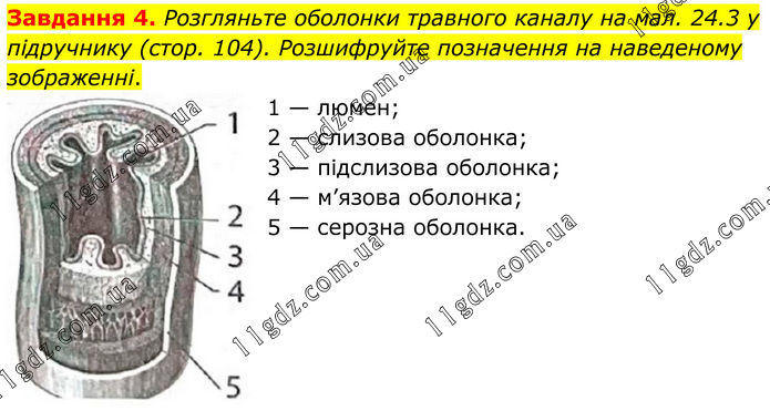 Завдання 4. Розгляньте оболонки травного каналу на мал. 24.3 у підручнику (стор. 104). Розшифруйте позначення на наведеному зображенні. 1 — люмен; 2 — слизова оболонка; 3 — підслизова оболонка; 4 — м’язова оболонка; 5 — серозна оболонка.
