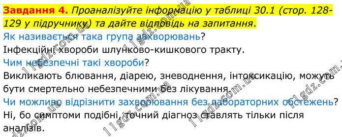 Завдання 4. Проаналізуйте інформацію у таблиці 30.1 (стор. 128-129 у підручнику) та дайте відповідь на запитання. Як називається така група захворювань? Інфекційні хвороби шлунково-кишкового тракту. Чим небезпечні такі хвороби? Викликають блювання, діарею, зневоднення, інтоксикацію, можуть бути смертельно небезпечними без лікування. Чи можливо відрізнити захворювання без лабораторних обстежень? Ні, бо симптоми подібні, точний діагноз ставлять тільки після аналізів.