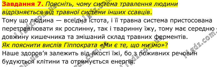 Завдання 7. Поясніть, чому система травлення людини відрізняється від травної системи інших ссавців. Тому що людина — всеїдна істота, і її травна система пристосована перетравлювати як рослинну, так і тваринну їжу, тому має середню довжину кишечника та змішаний склад травних ферментів. Як пояснити вислів Гіппократа «Ми є те, що ми їмо»? Наше здоров’я залежить від якості їжі, бо з поживних речовин будуються клітини та отримується енергія.