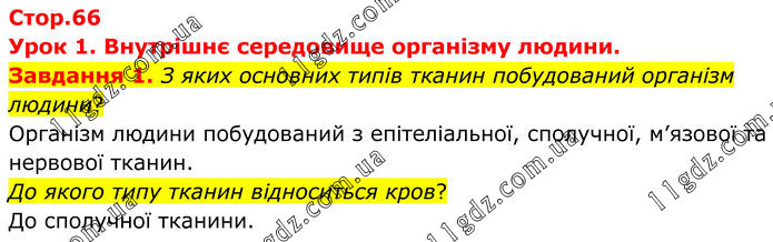 Урок 1. Внутрішнє середовище організму людини. Завдання 1. З яких основних типів тканин побудований організм людини? Організм людини побудований з епітеліальної, сполучної, м’язової та нервової тканин. До якого типу тканин відноситься кров? До сполучної тканини.