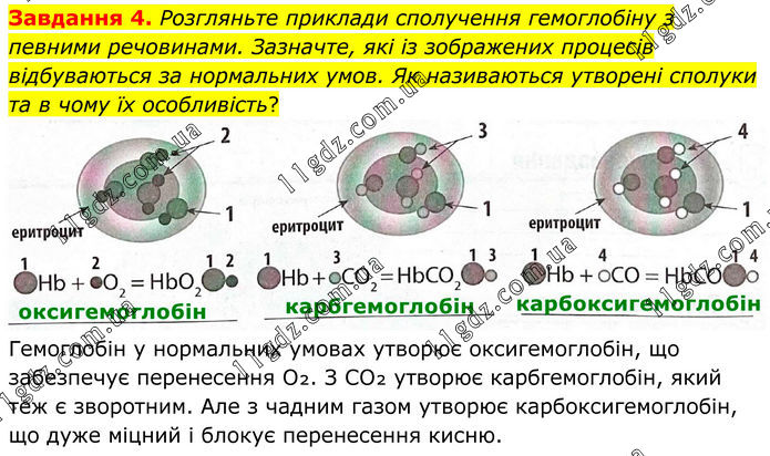 Завдання 4. Розгляньте приклади сполучення гемоглобіну з певними речовинами. Зазначте, які із зображених процесів відбуваються за нормальних умов. Як називаються утворені сполуки та в чому їх особливість? Гемоглобін у нормальних умовах утворює оксигемоглобін, що забезпечує перенесення О₂. З CO₂ утворює карбгемоглобін, який теж є зворотним. Але з чадним газом утворює карбоксигемоглобін, що дуже міцний і блокує перенесення кисню.