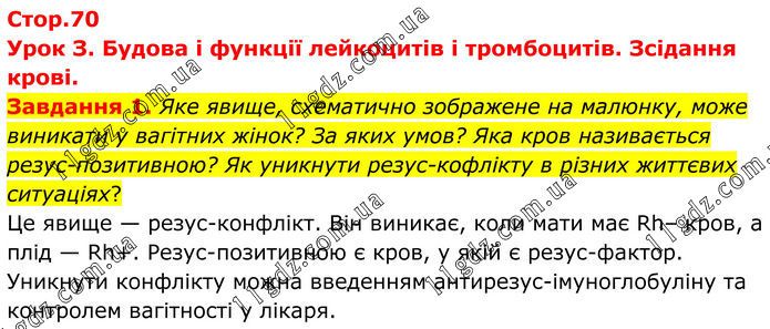 Стор.70 Урок З. Будова і функції лейкоцитів і тромбоцитів. Зсідання крові. Завдання 1. Яке явище, схематично зображене на малюнку, може виникати у вагітних жінок? За яких умов? Яка кров називається резус-позитивною? Як уникнути резус-кофлікту в різних життєвих ситуаціях? Це явище — резус-конфлікт. Він виникає, коли мати має Rh– кров, а плід — Rh+. Резус-позитивною є кров, у якій є резус-фактор. Уникнути конфлікту можна введенням антирезус-імуноглобуліну та контролем вагітності у лікаря.