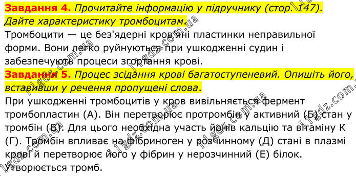 Завдання 4. Прочитайте інформацію у підручнику (стор. 147). Дайте характеристику тромбоцитам. Тромбоцити — це без'ядерні кров’яні пластинки неправильної форми. Вони легко руйнуються при ушкодженні судин і забезпечують процеси згортання крові. Завдання 5. Процес зсідання крові багатоступеневий. Опишіть його, вставивши у речення пропущені слова. При ушкодженні тромбоцитів у кров вивільняється фермент тромбопластин (А). Він перетворює протромбін у активний (Б) стан у тромбін (В). Для цього необхідна участь йонів кальцію та вітаміну К (Г). Тромбін впливає на фібриноген у розчинному (Д) стані в плазмі крові й перетворює його у фібрин у нерозчинний (Е) білок. Утворюється тромб.