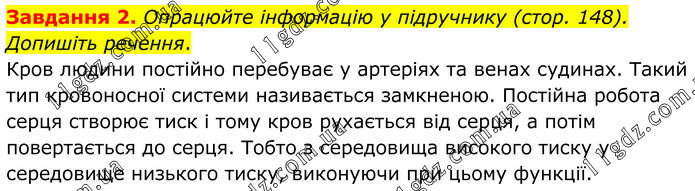Завдання 2. Опрацюйте інформацію у підручнику (стор. 148). Допишіть речення. Кров людини постійно перебуває у артеріях та венах судинах. Такий тип кровоносної системи називається замкненою. Постійна робота серця створює тиск і тому кров рухається від серця, а потім повертається до серця. Тобто з середовища високого тиску у середовище низького тиску, виконуючи при цьому функції.
