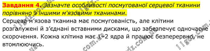Завдання 4. Зазначте особливості посмугованої серцевої тканини порівняно з іншими м'язовими тканинами. Серцева м’язова тканина має посмугованість, але клітини розгалужені й з’єднані вставними дисками, що забезпечує одночасне скорочення. Кожна клітина має 1–2 ядра й працює безперервно, не втомлюючись.