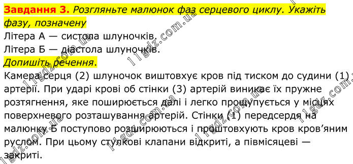 Завдання 3. Розгляньте малюнок фаз серцевого циклу. Укажіть фазу, позначену Літера А — систола шлуночків. Літера Б — діастола шлуночків. Допишіть речення. Камера серця (2) шлуночок виштовхує кров під тиском до судини (1) артерії. При ударі крові об стінки (3) артерій виникає їх пружне розтягнення, яке поширюється далі і легко прощупується у місцях поверхневого розташування артерій. Стінки (1) передсердя на малюнку Б поступово розширюються і проштовхують кров кров’яним руслом. При цьому стулкові клапани відкриті, а півмісяцеві — закриті.