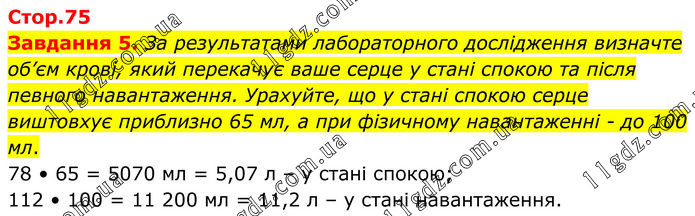 Завдання 5. За результатами лабораторного дослідження визначте об’єм крові, який перекачує ваше серце у стані спокою та після певного навантаження. Урахуйте, що у стані спокою серце виштовхує приблизно 65 мл, а при фізичному навантаженні - до 100 мл. 78 • 65 = 5070 мл = 5,07 л – у стані спокою; 112 • 100 = 11 200 мл = 11,2 л – у стані навантаження.