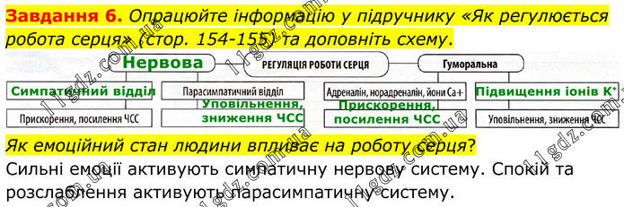 Завдання 6. Опрацюйте інформацію у підручнику «Як регулюється робота серця» (стор. 154-155) та доповніть схему. Як емоційний стан людини впливає на роботу серця? Сильні емоції активують симпатичну нервову систему. Спокій та розслаблення активують парасимпатичну систему.