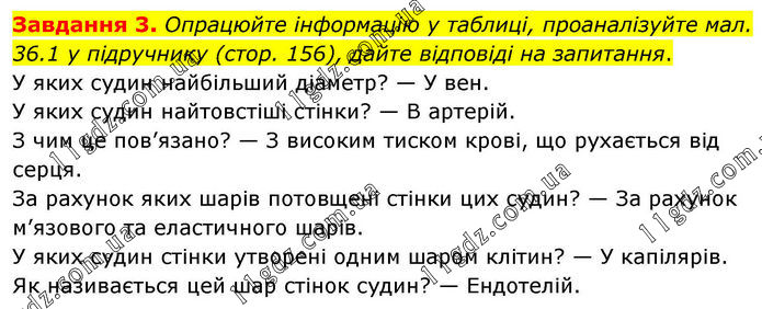 Завдання 3. Опрацюйте інформацію у таблиці, проаналізуйте мал. 36.1 у підручнику (стор. 156), дайте відповіді на запитання. У яких судин найбільший діаметр? — У вен. У яких судин найтовстіші стінки? — В артерій. З чим це пов’язано? — З високим тиском крові, що рухається від серця. За рахунок яких шарів потовщені стінки цих судин? — За рахунок м’язового та еластичного шарів. У яких судин стінки утворені одним шаром клітин? — У капілярів. Як називається цей шар стінок судин? — Ендотелій.