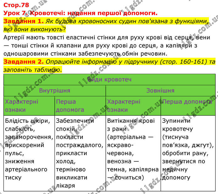 Стор.78 Урок 7. Кровотечі: надання першої допомоги. Завдання 1. Як будова кровоносних судин пов'язана з функціями, які вони виконують? Артерії мають товсті еластичні стінки для руху крові від серця, вени — тонші стінки й клапани для руху крові до серця, а капіляри з одношаровими стінками забезпечують обмін речовин. Завдання 2. Опрацюйте інформацію у підручнику (стор. 160-161) та заповніть таблицю. Види кровотеч Внутрішня Зовнішня Характерні ознаки Перша допомога Характерні ознаки Перша допомога Блідість шкіри, слабкість, запаморочення, прискорений пульс, зниження артеріального тиску Забезпечити спокій, покласти постраждалого, прикласти холод, терміново викликати лікаря Витікання крові з рани (артеріальна — яскраво-червона, венозна — темна, капілярна — сочиться) Зупинити кровотечу (тиснуча пов’язка, джгут), обробити рану, звернутися по медичну допомогу