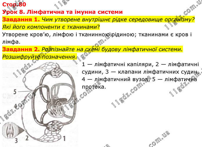 Стор.80 Урок 8. Лімфатична та імунна системи Завдання 1. Чим утворене внутрішнє рідке середовище організму? Які його компоненти є тканинами? Утворене кров’ю, лімфою і тканинною рідиною; тканинами є кров і лімфа. Завдання 2. Розпізнайте на схемі будову лімфатичної системи. Розшифруйте позначення. 1 — лімфатичні капіляри, 2 — лімфатичні судини, 3 — клапани лімфатичних судин, 4 — лімфатичний вузол, 5 — лімфатична протока.