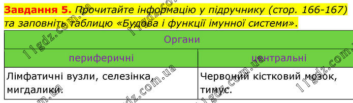 Завдання 5. Прочитайте інформацію у підручнику (стор. 166-167) та заповніть таблицю «Будова і функції імунної системи». Органи периферичні центральні Лімфатичні вузли, селезінка, мигдалики. Червоний кістковий мозок, тимус.