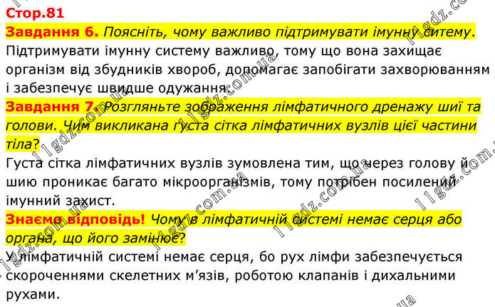 Стор.81 Завдання 6. Поясніть, чому важливо підтримувати імунну ситему. Підтримувати імунну систему важливо, тому що вона захищає організм від збудників хвороб, допомагає запобігати захворюванням і забезпечує швидше одужання. Завдання 7. Розгляньте зображення лімфатичного дренажу шиї та голови. Чим викликана густа сітка лімфатичних вузлів цієї частини тіла? Густа сітка лімфатичних вузлів зумовлена тим, що через голову й шию проникає багато мікроорганізмів, тому потрібен посилений імунний захист. Знаємо відповідь! Чому в лімфатичній системі немає серця або органа, що його замінює? У лімфатичній системі немає серця, бо рух лімфи забезпечується скороченнями скелетних м’язів, роботою клапанів і дихальними рухами.