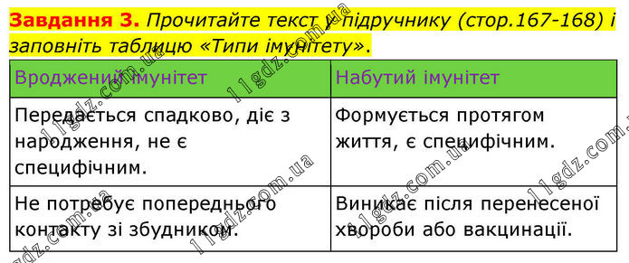 Завдання 3. Прочитайте текст у підручнику (стор.167-168) і заповніть таблицю «Типи імунітету». Вроджений імунітет Набутий імунітет Передається спадково, діє з народження, не є специфічним. Формується протягом життя, є специфічним. Не потребує попереднього контакту зі збудником. Виникає після перенесеної хвороби або вакцинації.