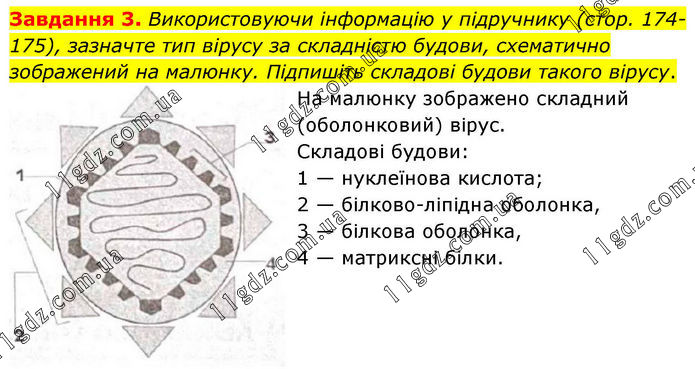 Завдання 3. Використовуючи інформацію у підручнику (стор. 174-175), зазначте тип вірусу за складністю будови, схематично зображений на малюнку. Підпишіть складові будови такого вірусу. На малюнку зображено складний (оболонковий) вірус. Складові будови: 1 — нуклеїнова кислота; 2 — білково-ліпідна оболонка, 3 — білкова оболонка, 4 — матриксні білки.