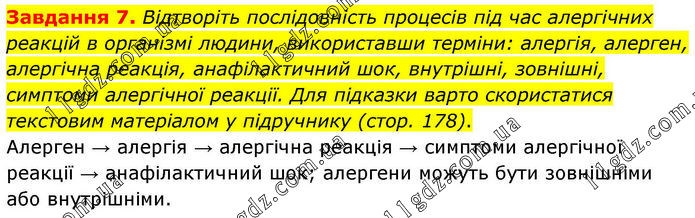 Завдання 7. Відтворіть послідовність процесів під час алергічних реакцій в організмі людини, використавши терміни: алергія, алерген, алергічна реакція, анафілактичний шок, внутрішні, зовнішні, симптоми алергічної реакції. Для підказки варто скористатися текстовим матеріалом у підручнику (стор. 178). Алерген → алергія → алергічна реакція → симптоми алергічної реакції → анафілактичний шок; алергени можуть бути зовнішніми або внутрішніми.