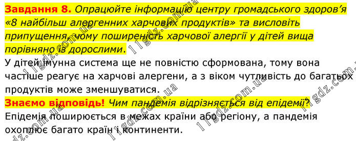 Завдання 8. Опрацюйте інформацію центру громадського здоров’я «8 найбільш алергенних харчових продуктів» та висловіть припущення, чому поширеність харчової алергії у дітей вища порівняно із дорослими. У дітей імунна система ще не повністю сформована, тому вона частіше реагує на харчові алергени, а з віком чутливість до багатьох продуктів може зменшуватися. Знаємо відповідь! Чим пандемія відрізняється від епідемії? Епідемія поширюється в межах країни або регіону, а пандемія охоплює багато країн і континенти.