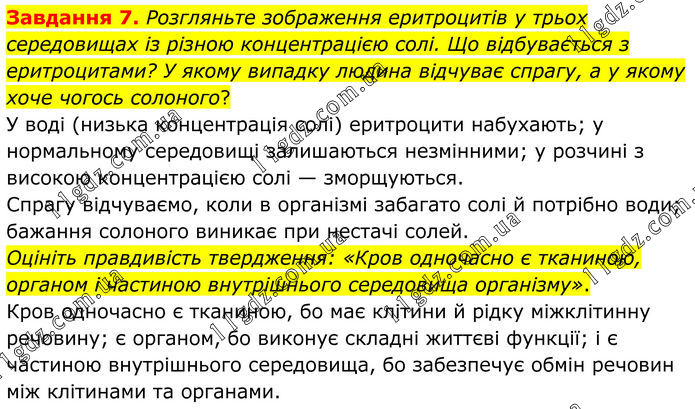 Завдання 7. Розгляньте зображення еритроцитів у трьох середовищах із різною концентрацією солі. Що відбувається з еритроцитами? У якому випадку людина відчуває спрагу, а у якому хоче чогось солоного? У воді (низька концентрація солі) еритроцити набухають; у нормальному середовищі залишаються незмінними; у розчині з високою концентрацією солі — зморщуються. Спрагу відчуваємо, коли в організмі забагато солі й потрібно води; бажання солоного виникає при нестачі солей. Оцініть правдивість твердження: «Кров одночасно є тканиною, органом і частиною внутрішнього середовища організму». Кров одночасно є тканиною, бо має клітини й рідку міжклітинну речовину; є органом, бо виконує складні життєві функції; і є частиною внутрішнього середовища, бо забезпечує обмін речовин між клітинами та органами.