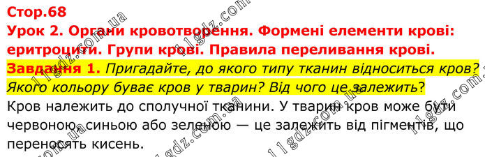 Стор.68 Урок 2. Органи кровотворення. Формені елементи крові: еритроцити. Групи крові. Правила переливання крові. Завдання 1. Пригадайте, до якого типу тканин відноситься кров? Якого кольору буває кров у тварин? Від чого це залежить? Кров належить до сполучної тканини. У тварин кров може бути червоною, синьою або зеленою — це залежить від пігментів, що переносять кисень.