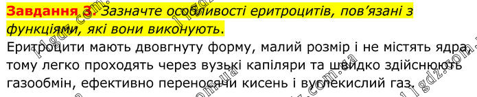 Завдання 3. Зазначте особливості еритроцитів, пов’язані з функціями, які вони виконують. Еритроцити мають двовгнуту форму, малий розмір і не містять ядра, тому легко проходять через вузькі капіляри та швидко здійснюють газообмін, ефективно переносячи кисень і вуглекислий газ.