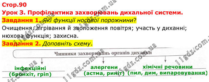 Стор.90 Урок З. Профілактика захворювань дихальної системи. Завдання 1. Які функції носової порожнини? Очищення, зігрівання й зволоження повітря; участь у диханні; нюхова функція; захисна. Завдання 2. Доповніть схему.