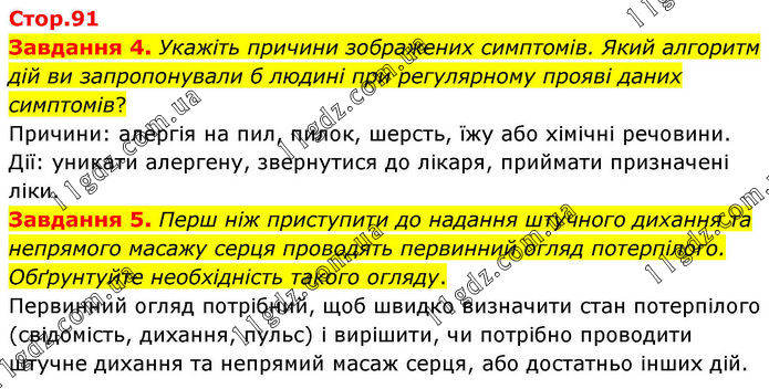 Стор.91 Завдання 4. Укажіть причини зображених симптомів. Який алгоритм дій ви запропонували б людині при регулярному прояві даних симптомів? Причини: алергія на пил, пилок, шерсть, їжу або хімічні речовини. Дії: уникати алергену, звернутися до лікаря, приймати призначені ліки. Завдання 5. Перш ніж приступити до надання штучного дихання та непрямого масажу серця проводять первинний огляд потерпілого. Обґрунтуйте необхідність такого огляду. Первинний огляд потрібний, щоб швидко визначити стан потерпілого (свідомість, дихання, пульс) і вирішити, чи потрібно проводити штучне дихання та непрямий масаж серця, або достатньо інших дій.
