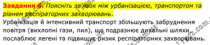 Завдання 6. Поясніть зв'язок між урбанізацією, транспортом та рівнем респіраторних захворювань. Урбанізація й інтенсивний транспорт збільшують забруднення повітря (вихлопні гази, пил), що подразнює дихальні шляхи, послаблює легені та підвищує ризик респіраторних захворювань.