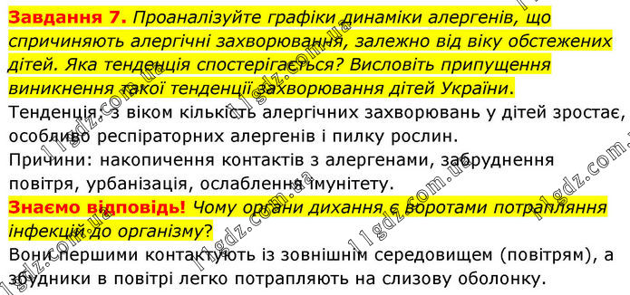 Завдання 7. Проаналізуйте графіки динаміки алергенів, що спричиняють алергічні захворювання, залежно від віку обстежених дітей. Яка тенденція спостерігається? Висловіть припущення виникнення такої тенденції захворювання дітей України. Тенденція: з віком кількість алергічних захворювань у дітей зростає, особливо респіраторних алергенів і пилку рослин. Причини: накопичення контактів з алергенами, забруднення повітря, урбанізація, ослаблення імунітету. Знаємо відповідь! Чому органи дихання є воротами потрапляння інфекцій до організму? Вони першими контактують із зовнішнім середовищем (повітрям), а збудники в повітрі легко потрапляють на слизову оболонку.