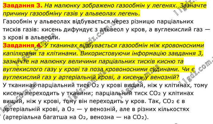 Завдання 3. На малюнку зображено газообмін у легенях. Зазначте причину газообміну газів у альвеолах легень. Газообмін у альвеолах відбувається через різницю парціальних тисків газів: кисень дифундує з альвеол у кров, а вуглекислий газ — з крові в альвеоли. Завдання 4. У тканинах відбувається газообмін між кровоносними капілярами та клітинами. Використовуючи інформацію завдання 3, зазначте на малюнку величини парціальних тисків кисню та вуглекислого газу у крові та поза кровоносними судинами. Чи є вуглекислий газ у артеріальній крові, а кисень у венозній? У тканинах парціальний тиск O₂ у крові вищий, ніж у клітинах, тому кисень переходить у тканини; парціальний тиск CO₂ у клітинах вищий, ніж у крові, тому він переходить у кров. Так, CO₂ є в артеріальній крові, а O₂ — у венозній, але в різних кількостях (артеріальна багатша на O₂, венозна — на CO₂).
